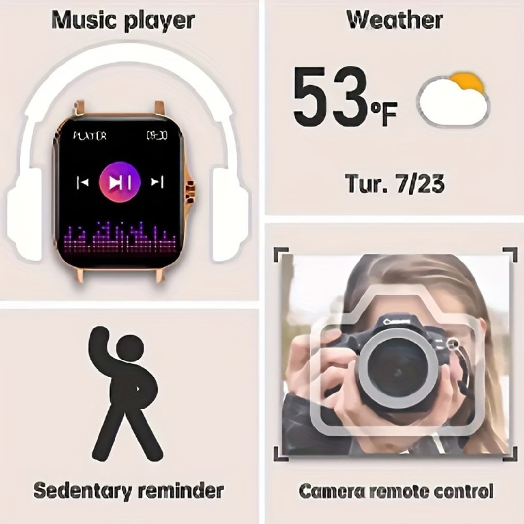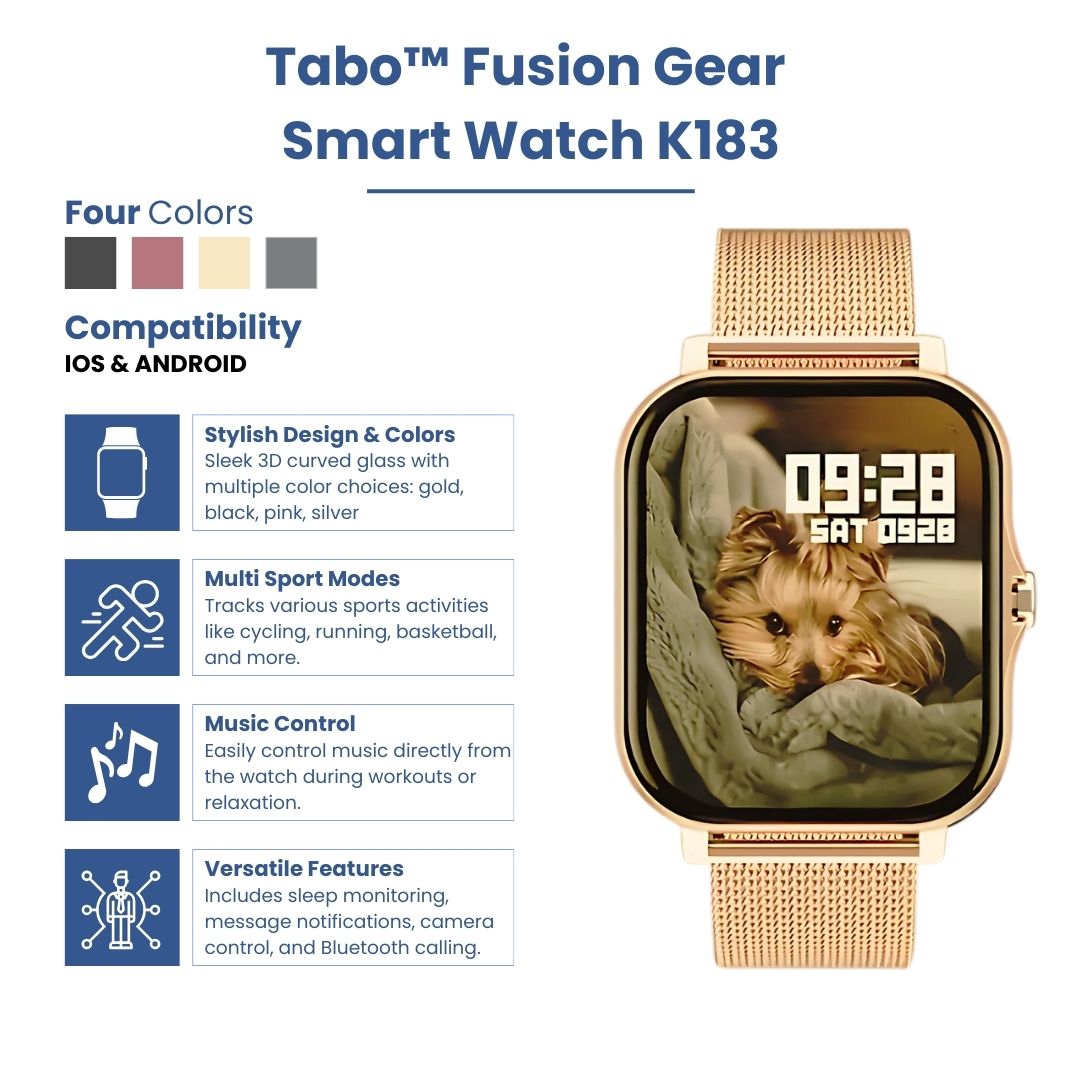 The Tabo™ Fusion Gear is not just a smartwatch, but also a sophisticated fashion accessory. With its 3D curved glass and bezel-less design, the watch exudes modern elegance. Users can choose from various colors, including gold, black, pink, and silver, easily complementing any style.